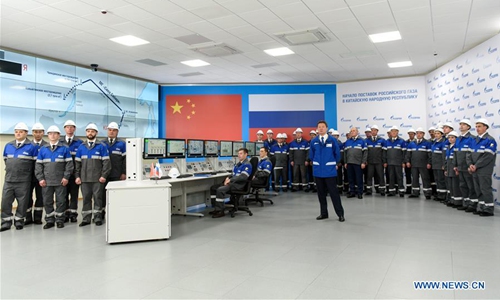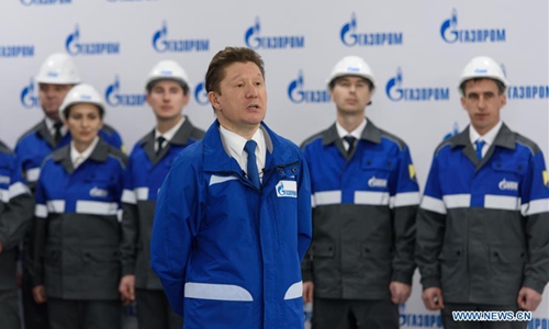 Alexey Miller (front), head of Russian gas giant Gazprom, and staff members attend the launching ceremony of the China-Russia east-route natural gas pipeline at a gas-distributing and compressing station in Amur region, Russia, Dec. 2, 2019. The China-Russia east-route natural gas pipeline was put into operation on Monday. (Xinhua)