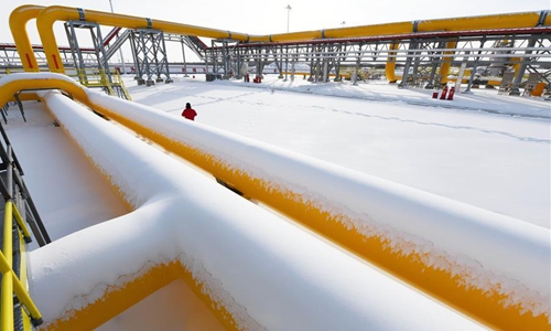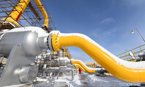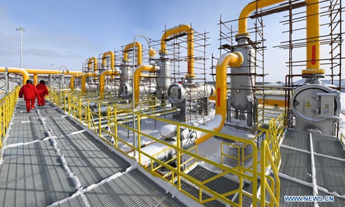 Staff members inspect the gas-distributing and compressing station of the China-Russia east-route natural gas pipeline in the city of Heihe, the first stop after the Russia-supplied natural gas enters China, northeast China's Heilongjiang Province, Nov. 19, 2019. The China-Russia east-route natural gas pipeline was put into operation on Monday. The pipeline is scheduled to provide China with 5 billion cubic meters of Russian gas in 2020 and the amount is expected to increase to 38 billion cubic meters annually from 2024, under a 30-year contract worth 400 billion U.S. dollars signed between the China National Petroleum Corp (CNPC) and Russian gas giant Gazprom in May 2014. The cross-border gas pipeline has a 3,000-km section in Russia and a 5,111-km stretch in China. (Xinhua/Wang Jianwei)