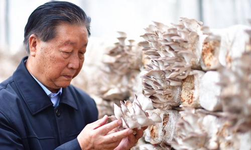 Lin Zhanxi, professor of the Fujian Agriculture and Forestry University, checked mushrooms cultivated in chopped JUNCAO (meaning "the herbal plant for growing edible mushrooms") in Fuzhou, Fujian Province, southeast China, Nov. 2, 2018. (Xinhua/Wei Peiquan)