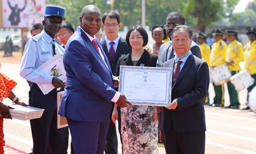 Faustin-Archange Touadera, President of the Central African Republic (CAR), honored Chinese JUNCAO experts for their contribution to the nation's agriculture development through the transfer of JUNCAO technology. (Tian Yutong/Xinhua)