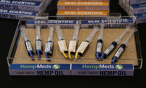 Cartridges of cannabidiol (CBD)-rich hemp oil for medical use are displayed during the International Cannabis Association Convention in New York, October 12, 2014. Photo: VCG