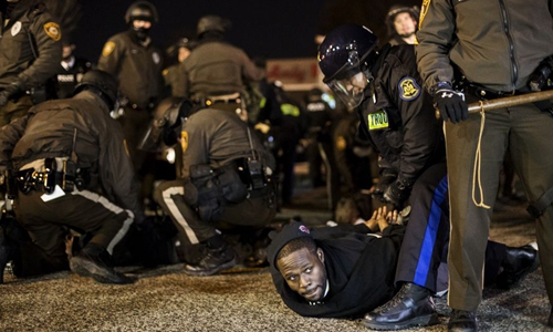 Policemen arrest a protester in front of the Ferguson PD Station in Ferguson, Missouri, the United States, on Nov. 28, 2014. (Xinhua/Jim Vondruska)