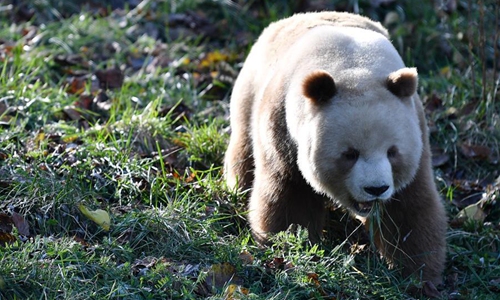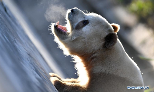 Qizai, a rare brown and white giant panda, is seen at Qinling Research Base of Giant Panda Breeding of Shaanxi Academy of Forestry in Xi'an, northwest China's Shaanxi Province, Dec. 3, 2019. (Xinhua/Zhang Bowen)
