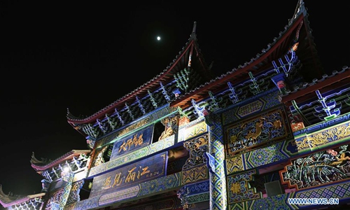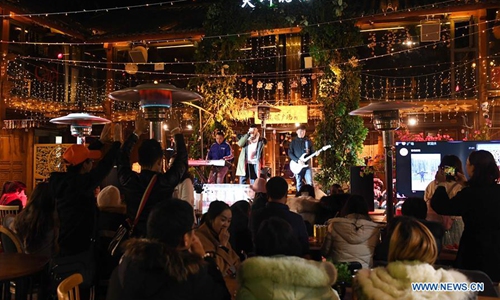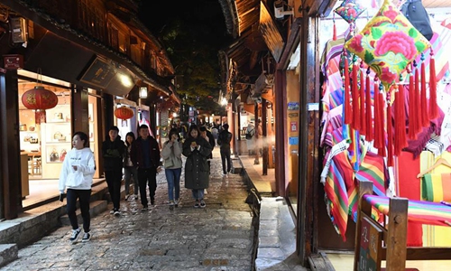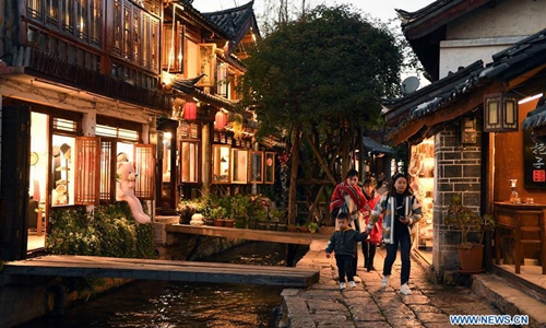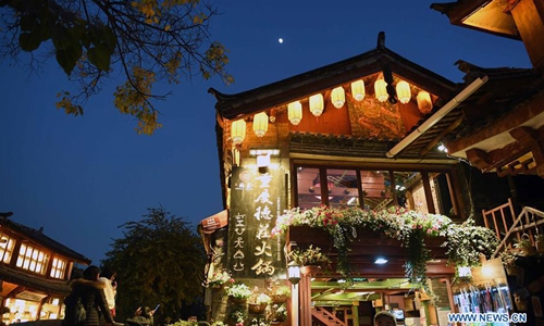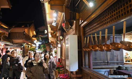 People tour Lijiang ancient town, southwest China's Yunnan Province, at night Dec. 7, 2019. (Xinhua/Yang Zongyou)