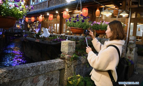 A tourist takes photos of the night scenery in Lijiang ancient town, southwest China's Yunnan Province, Dec. 7, 2019. (Xinhua/Yang Zongyou)