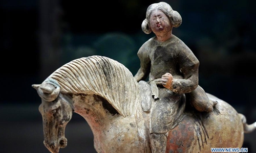 Photo taken on Dec. 6, 2019 shows a colored horsewoman figure of Tang Dynasty (618-907) displayed at Xi'an Museum in Xi'an, capital city of northwest China's Shaanxi Province. (Xinhua/Liu Xiao)