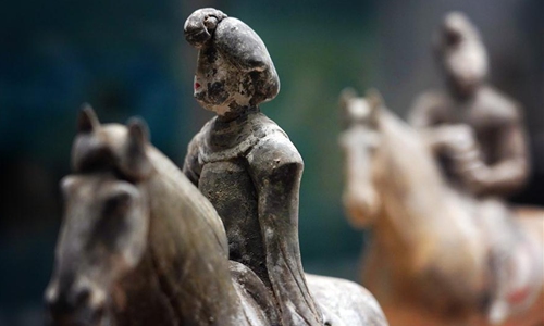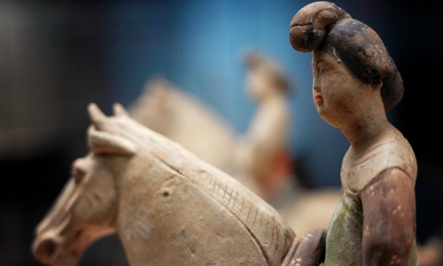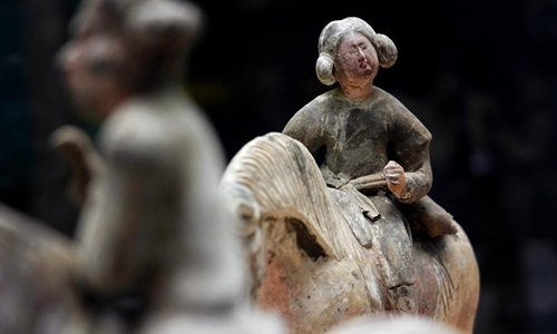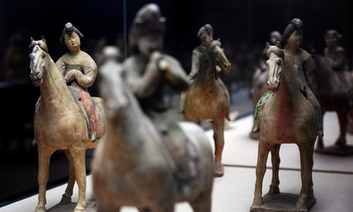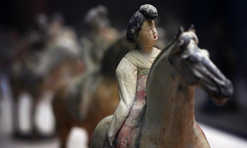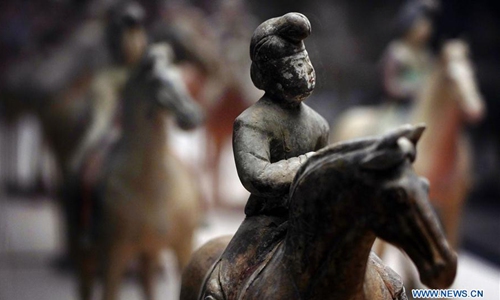 Photo taken on Dec. 6, 2019 shows colored horsewoman figures of Tang Dynasty (618-907) displayed at Xi'an Museum in Xi'an, capital city of northwest China's Shaanxi Province. (Xinhua/Liu Xiao)
