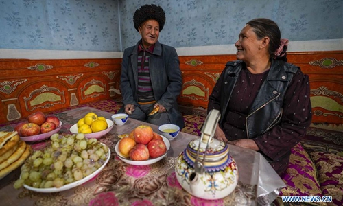 A man and his wife rest in their house at the Qushou Village of Saybag Township in Moyu County, northwest China's Xinjiang Uygur Autonomous Region, Nov. 21, 2019. A series of housing projects in 22 impoverished counties in southern Xinjiang Uygur Autonomous Region have benefited around 396,100 households since 2018, not only providing better homes for those who once lived in shabby residences but also boosting their source of livelihood. Measures including "toilet revolution" and flower planting have been carried out in these poverty-stricken villages. Based on the successful experience in the south of Xinjiang, local authorities have pushed forward the building of "beautiful courtyard" project in all villages of Xinjiang in a bid to improve locals' living standards since 2019. Photo:Xinhua