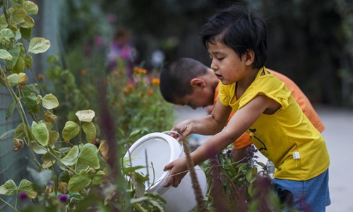 Children water flowers in an alley at Qianjin Village in Kashgar, northwest China's Xinjiang Uygur Autonomous Region, Aug. 18, 2019. Photo:Xinhua