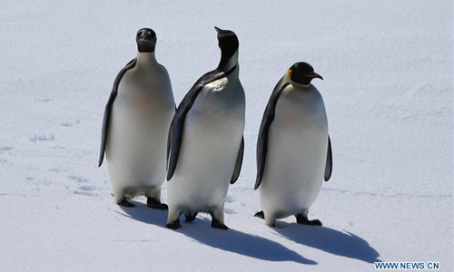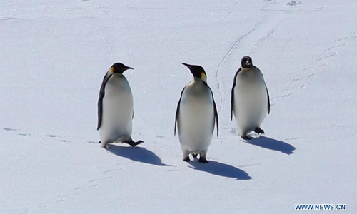 Emperor penguins walk near China's polar icebreaker Xuelong 2 in the Antarctica's Prydz Bay, Dec. 6, 2019. Team members of China's 36th Antarctic expedition conducted multidisciplinary observations and researches in Antarctica's Prydz Bay from Dec. 3, to Dec. 7. (Xinhua/Liu Shiping)