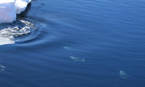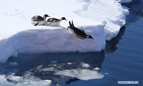 Emperor penguins dive into the ocean in the Antarctica's Prydz Bay, Dec. 6, 2019. Team members of China's 36th Antarctic expedition conducted multidisciplinary observations and researches in Antarctica's Prydz Bay from Dec. 3, to Dec. 7. (Xinhua/Liu Shiping)