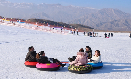 Visitors enjoy sledding on Tuesday at the Baicheng hot spring skiing venue in Baicheng county, Aksu in Northwest China’s Xinjiang Uyghur Autonomous Region. Photo: Shan Jie/GT