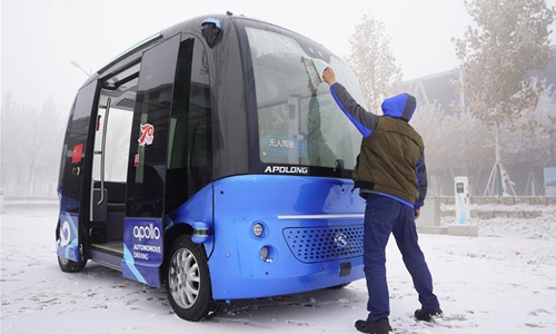 A worker cleans snow covered on a driverless bus in Xiong'an, north China's Hebei Province, Dec. 10, 2019. "Unmanned" technologies have brought great convenience to the city life in Xiong'an. (Xinhua/Xing Guangli)