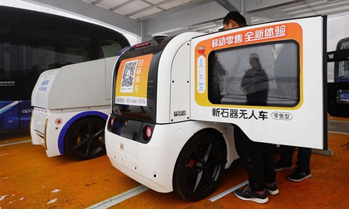 A worker maintains an unmanned retail car in Xiong'an, north China's Hebei Province, Dec. 10, 2019. "Unmanned" technologies have brought great convenience to the city life in Xiong'an. (Xinhua/Xing Guangli)