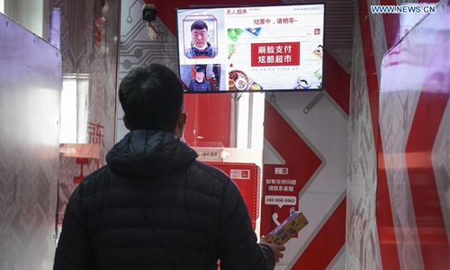 A customer pays by scanning face at a self-service supermarket in Xiong'an, north China's Hebei Province, Dec. 10, 2019. "Unmanned" technologies have brought great convenience to the city life in Xiong'an. (Xinhua/Yin Gang)