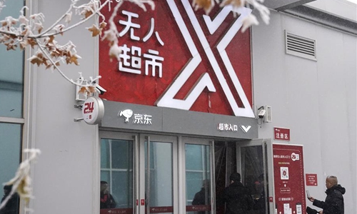 People select goods at a self-service supermarket in Xiong'an, north China's Hebei Province, Dec. 10, 2019. "Unmanned" technologies have brought great convenience to the city life in Xiong'an. (Xinhua/Yin Gang)