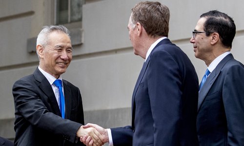 Chinese Vice Premier Liu He (left) shakes hands with US Trade Representative Robert Lighthizer (center) alongside US Treasury Secretary Steven Mnuchin as Liu arrives at the Office of the US Trade Representative for trade negotiations in Washington DC, Friday. Photo: AP