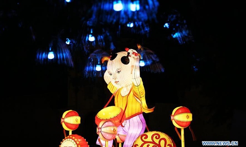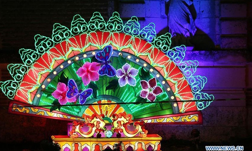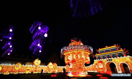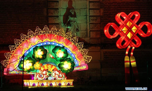 A light installation from Zigong, a city in southwest China's Sichuan Province, is seen during the Chinese Lantern Festival at the Castle of Selles sur Cher, 228 kilometers south of Paris, France, Dec. 15, 2019. (Xinhua/Gao Jing)