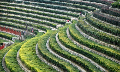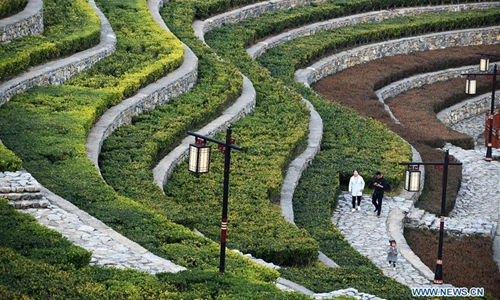 People go sightseeing in a terraced field in Shexiang ancient town in Dafang County of Bijie, southwest China's Guizhou Province, Dec. 16, 2019. Shexiang ancient town is a relocation area for residents living in impoverished regions with no sustainable conditions. Local government preserves the natural elements during planning and construction. In the center of the town, a total of 12 hectares of terraced fields, covered with ornamental plants, are built up to create a good environment for the people. (Xinhua/Yang Wenbin)