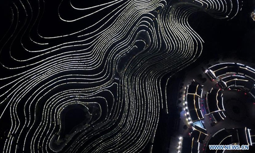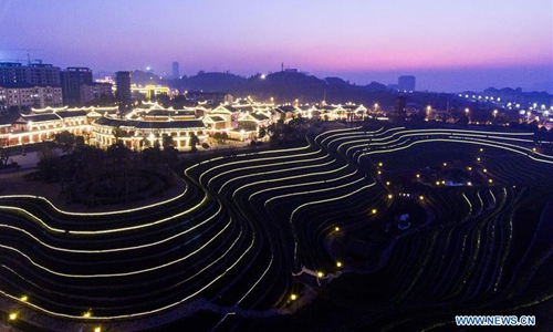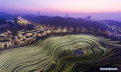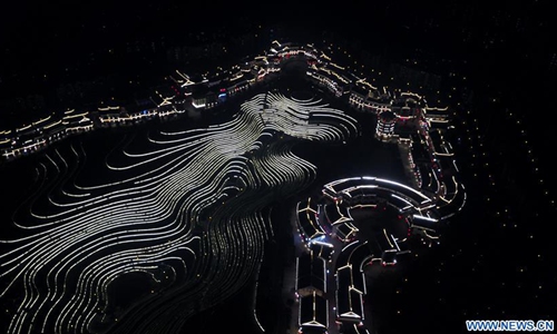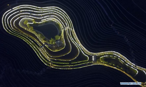 Aerial photo taken on Dec. 16, 2019 shows a night view of terraced fields in Shexiang ancient town in Dafang County of Bijie, southwest China's Guizhou Province. Shexiang ancient town is a relocation area for residents living in impoverished regions with no sustainable conditions. Local government preserves the natural elements during planning and construction. In the center of the town, a total of 12 hectares of terraced fields, covered with ornamental plants, are built up to create a good environment for the people. (Xinhua/Yang Wenbin)