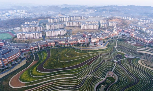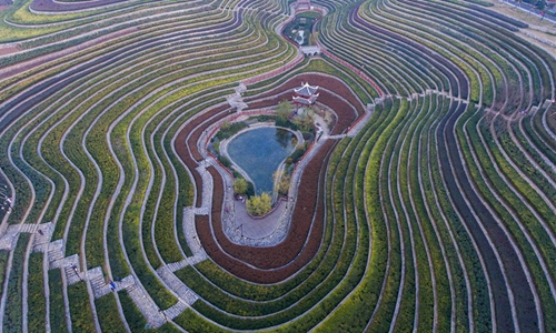Aerial photo taken on Dec. 16, 2019 shows terraced fields in Shexiang ancient town in Dafang County of Bijie, southwest China's Guizhou Province. Shexiang ancient town is a relocation area for residents living in impoverished regions with no sustainable conditions. Local government preserves the natural elements during planning and construction. In the center of the town, a total of 12 hectares of terraced fields, covered with ornamental plants, are built up to create a good environment for the people. (Xinhua/Yang Wenbin)