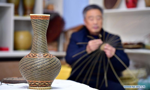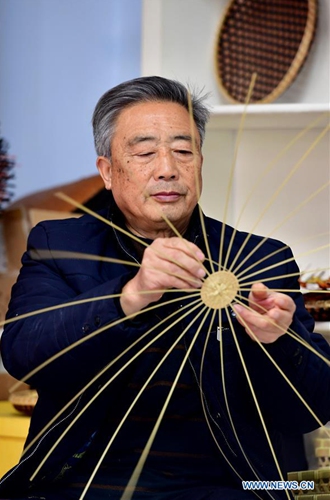 Zhang Yongjie makes woven bamboo wares in Dayuan Village of Chenwu Township, Luoning County, central China's Henan Province, Dec. 18, 2019. Zhang Yongjie, a 71-year-old farmer, began to learn weaving bamboo at the age of 15. In the 1980s, he followed a Japanese craftsman to learn bamboo weaving skills and went to Tokyo for further study. In 2015, bamboo weaving was included in the fourth batch of intangible cultural heritage in Henan Province. As a representative inheritor, Zhang Yongjie said he would keep innovating to attract more people to learn bamboo weaving. (Xinhua/Feng Dapeng)