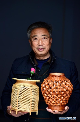 Zhang Yongjie shows woven bamboo wares in Dayuan Village of Chenwu Township, Luoning County, central China's Henan Province, Dec. 18, 2019. Zhang Yongjie, a 71-year-old farmer, began to learn weaving bamboo at the age of 15. In the 1980s, he followed a Japanese craftsman to learn bamboo weaving skills and went to Tokyo for further study. In 2015, bamboo weaving was included in the fourth batch of intangible cultural heritage in Henan Province. As a representative inheritor, Zhang Yongjie said he would keep innovating to attract more people to learn bamboo weaving. (Xinhua/Feng Dapeng)