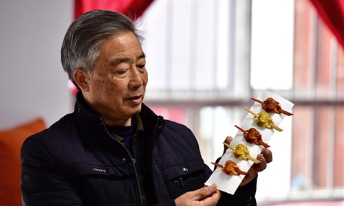 Zhang Yongjie shows woven bamboo hairpins in Dayuan Village of Chenwu Township, Luoning County, central China's Henan Province, Dec. 18, 2019. Zhang Yongjie, a 71-year-old farmer, began to learn weaving bamboo at the age of 15. In the 1980s, he followed a Japanese craftsman to learn bamboo weaving skills and went to Tokyo for further study. In 2015, bamboo weaving was included in the fourth batch of intangible cultural heritage in Henan Province. As a representative inheritor, Zhang Yongjie said he would keep innovating to attract more people to learn bamboo weaving. (Xinhua/Feng Dapeng)