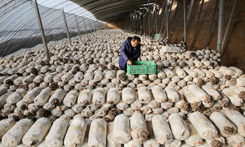 A farmer harvests mushroom in East China's Shandong Province on December 12. Photo: cnsphoto
