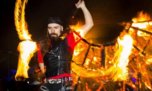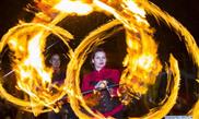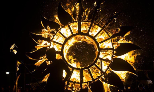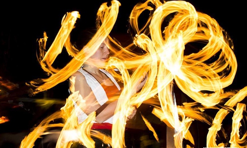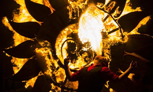 A performer plays with fire at the 2019 Kensington Market Winter Solstice Festival in Toronto, Canada, Dec. 21, 2019. This annual event was held here to celebrate the longest night of the year on Saturday with thousands of people. (Photo by Zou Zheng/Xinhua)