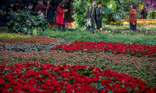 Tourists visit the floral greenhouse in the City of Flowers, a gardening complex in Kunming, capital of southwest China's Yunnan Province, Dec. 22, 2019. The City of Flowers, a large-scale gardening complex in Kunming, includes a floral greenhouse, an experimental museum and a 4D media hall in over 60,000 square meters. Photo:Xinhua