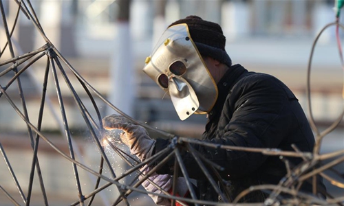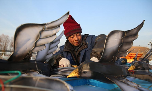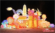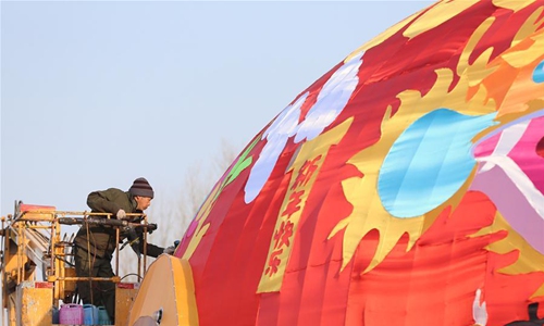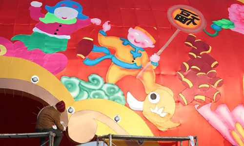 A worker makes a lantern in a flower expo park in Yinchuan, northwest China's Ningxia Hui Autonomous Region, Dec. 24, 2019. Workers make giant lanterns for the upcoming lantern festival which will be held from Dec. 31, 2019 to Feb. 9, 2020. (Xinhua/Jia Haocheng)