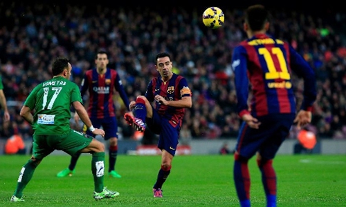 FC Barcelona's Xavier Hernandez Creus passes the ball during a Spanish La Liga soccer match at the Camp Nou stadium in Barcelona, Spain, on Feb. 15, 2015. Barcelona won 5-0. (Xinhua Photo)