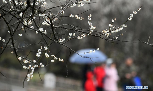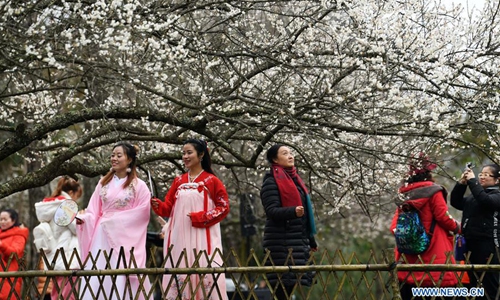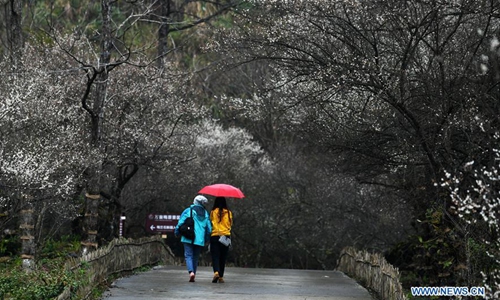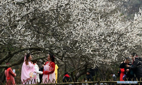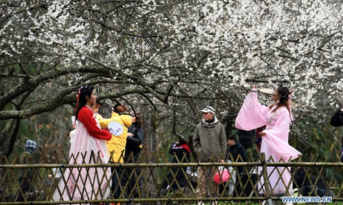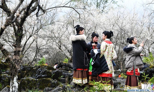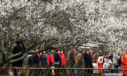 Tourists view plum flowers in Libo County, southwest China's Guizhou Province, Jan. 14, 2020. Libo ushered in a plum flower blossom season recently and has attracted thousands of visitors around China. Photo:Xinhua