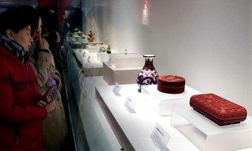Visitors view an exhibit during an exhibition of Emperor Qianlong in Zhengzhou, central China's Henan Province, Jan. 16, 2020. An exhibition showcasing cultural relics of Emperor Qianlong kicked off in Zhengzhou on Thursday. (Xinhua/Li An)