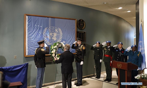 Photo taken on Jan. 17, 2020 shows a wreath-laying ceremony at the UN headquarters in New York. The United Nations on Friday held a wreath-laying ceremony to mark the 10th anniversary of a devastating earthquake in Haiti, which killed hundreds of thousands of people. (Xinhua/Li Muzi)