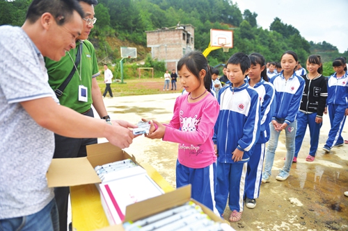 Students in a village school in Bouyei-Miao Autonomous Prefecture of Qiannan, Southwest China's Guizhou Province receive donations from a Shanghai company. Photo: cnsphoto