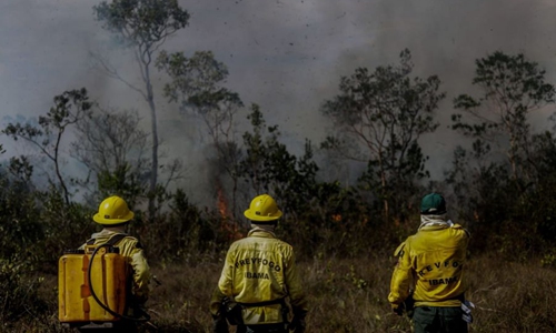 Workers of the Brazilian Institute of the Environment and Renewable Natural Resources fight a fire in Manicore, the state of Amazonas, Brazil on Aug. 26, 2019. (Gabriela Biro/Agencia Estado/Handout via Xinhua)