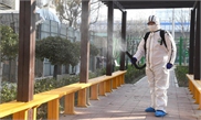 A staff member disinfects public seats at a community in Haidian District in Beijing, capital of China, Jan. 29, 2020. Haidian district of Beijing has carried out disinfection work with the help of professional staff at residential communities to curb the spread of the novel coronavirus. Photo: Xinhua