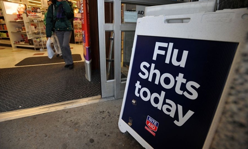 A sign advertising the availability of flu shots is put outside a CVS pharmacy store in New York, the US, January 15, 2013. (Xinhua/Wang Lei)