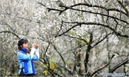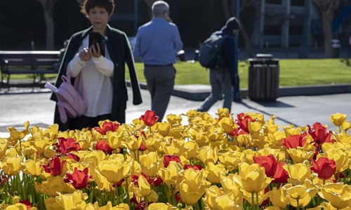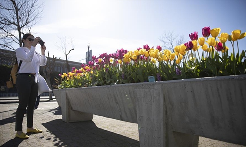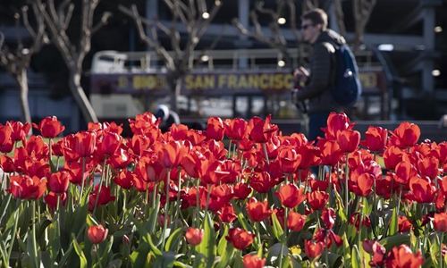 A visitor takes photos of the blooming tulips at a tulip exhibition in San Francisco, the United States, Feb. 12, 2020. (Photo by Li Jianguo/Xinhua)