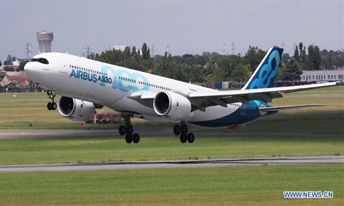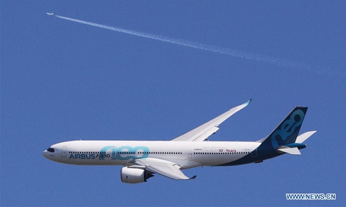 File photo shows that an Airbus A330 NEO performs during a flight display at the 53rd International Paris Air Show held at Le Bourget Airport near Paris, France, June 17, 2019. France-based European plane maker Airbus on Thursday reported a net loss of 1.36 billion euros (1.47 billion U.S. dollars) in 2019 after paying billions of euros of provision to settle a past bribery and corruption case related to jetliner sales. (Xinhua/Gao Jing)