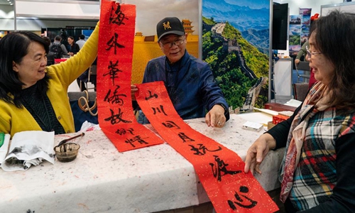 A senior writes an couplets in support of China's fight against the novel coronavirus at the annual Los Angeles Travel & Adventure Show in Los Angeles, the United States, Feb. 15, 2020. The two-day show kicked off here on Saturday. (Photo by Qian Weizhong/Xinhua)