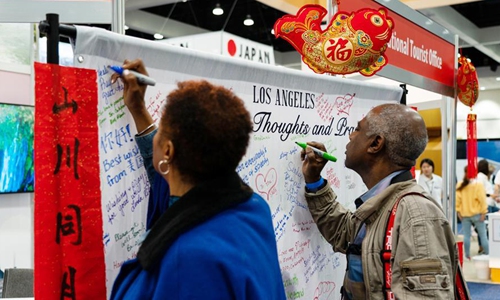 Visitors write down words in support of China's fight against the novel coronavirus at the annual Los Angeles Travel & Adventure Show in Los Angeles, the United States, Feb. 15, 2020. The two-day show kicked off here on Saturday. (Photo by Qian Weizhong/Xinhua)