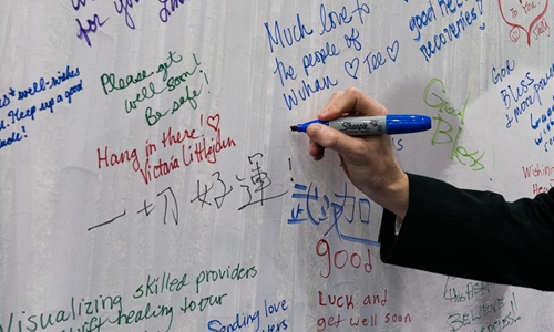 A visitor writes down words in support of China's fight against the novel coronavirus at the annual Los Angeles Travel & Adventure Show in Los Angeles, the United States, Feb. 15, 2020. The two-day show kicked off here on Saturday. (Photo by Qian Weizhong/Xinhua)