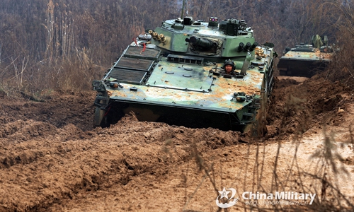 An infantry fighting vehicle (IFV) attached to a combined brigade under the PLA 72nd Group Army rumbles through the dirt road during a coordinated driving skills training exercise on February 19, 2020. Photo: China Military
