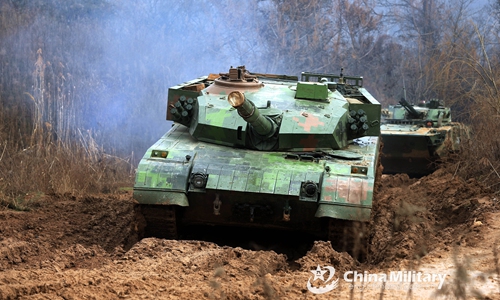 A Type 96A main battle tank (MBT) and an infantry fighting vehicle (IFV) attached to a combined brigade under the PLA 72nd Group Army rumble through the muddy road to a designated training area during a coordinated driving skills training exercise on February 19, 2020. Photo: China Military