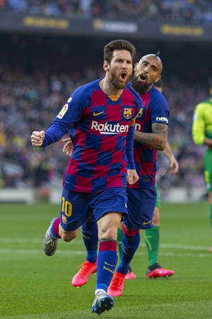 Lionel Messi (left) of Barcelona celebrates with Arturo Vidal after scoring his first of four goals during the match against Eibar on Saturday in Barcelona, Spain. Photo: VCG