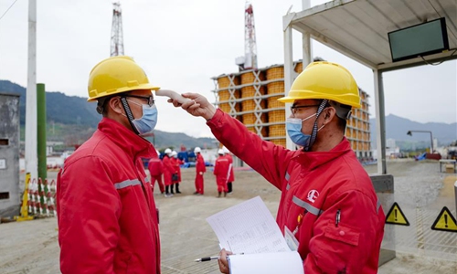 A staff member checks a technician's body temperature at a shale gas platform of China Petrochemical Corporation in southwest China's Chongqing Municipality, Feb. 22, 2020. A total of 14 operation points of the shale gas platform have resumed production, boosting the daily shale gas output from 2.11 million cubic meters to 2.53 million cubic meters that secured the downstream companies' operation needs amid the fight against the novel coronavirus outbreak. (Xinhua/Liu Chan)
