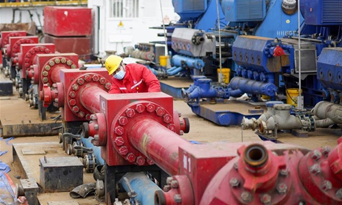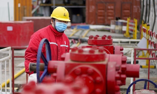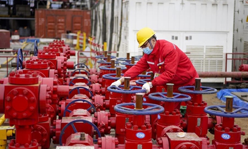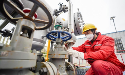 A technician examines equipment of a shale gas platform of China Petrochemical Corporation in southwest China's Chongqing Municipality, Feb. 22, 2020. A total of 14 operation points of the shale gas platform have resumed production, boosting the daily shale gas output from 2.11 million cubic meters to 2.53 million cubic meters that secured the downstream companies' operation needs amid the fight against the novel coronavirus outbreak. (Xinhua/Liu Chan)